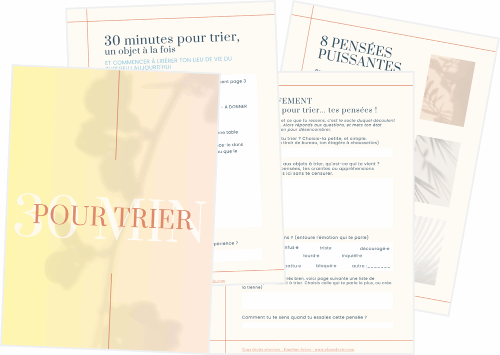 30 minutes pour faire place nette à un endroit qui en a besoin chez toi. Tu pourras réutiliser le pas à pas à volonté, et créer un effet boule de neige qui te mènera au bout de ton désencombrement.